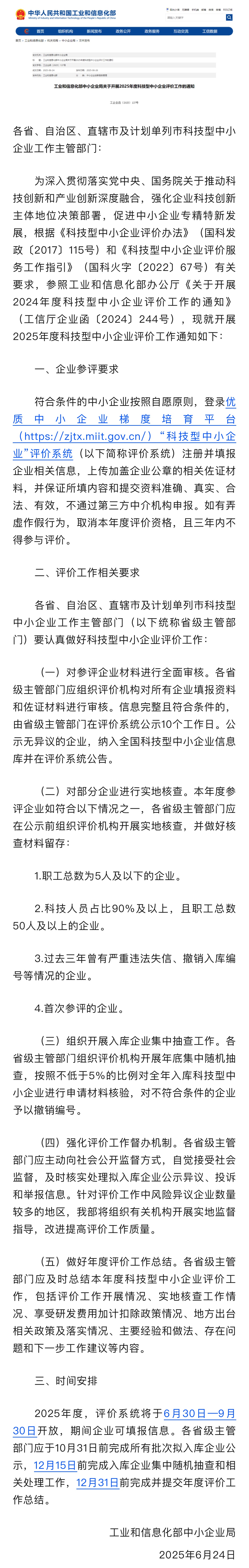 【政策導讀】工業(yè)和信息化部中小企業(yè)局關(guān)于開展2025年度科技型中小企業(yè)評價工作的通知